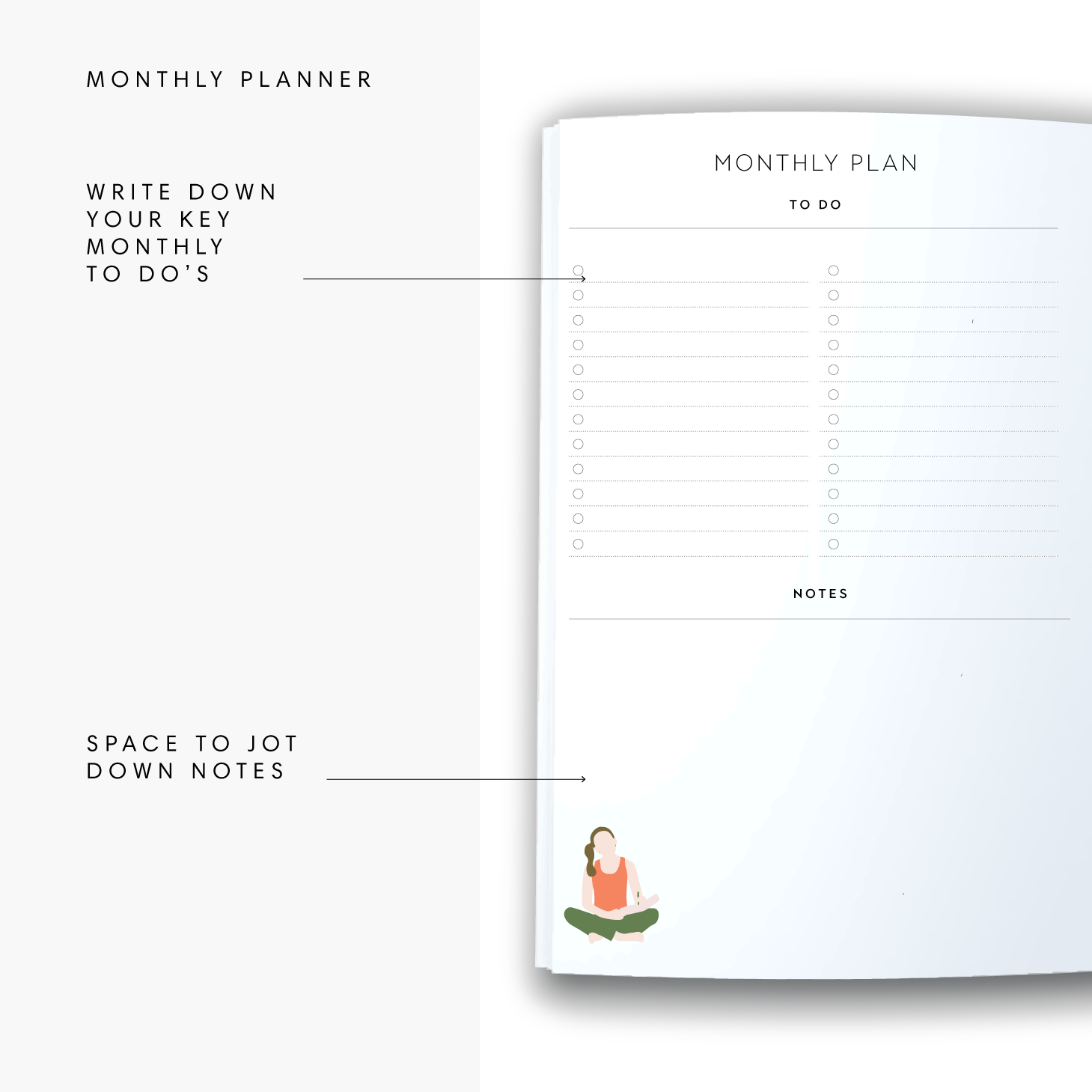 • Monthly Plan spread with sections for: To Do, Notes, Monthly Habit Tracker & Assignments. Helps you focus monthly on what’s most important.