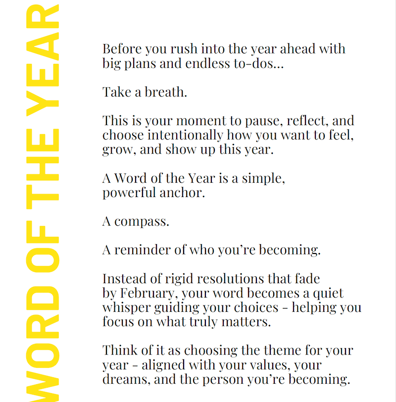 If you’re not sure what word to choose – take time to think about what you want more of in the year ahead, or what you want less of. Then choose a word that is a positive word that moves you away from what you want less of – or a word that moves you closer to what you want more of.